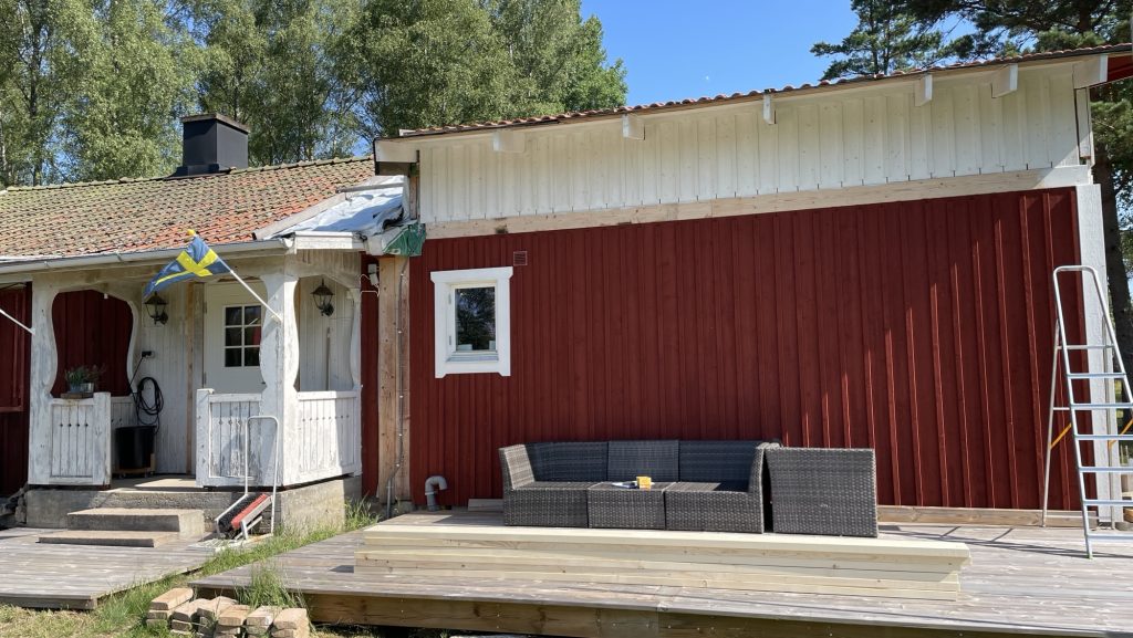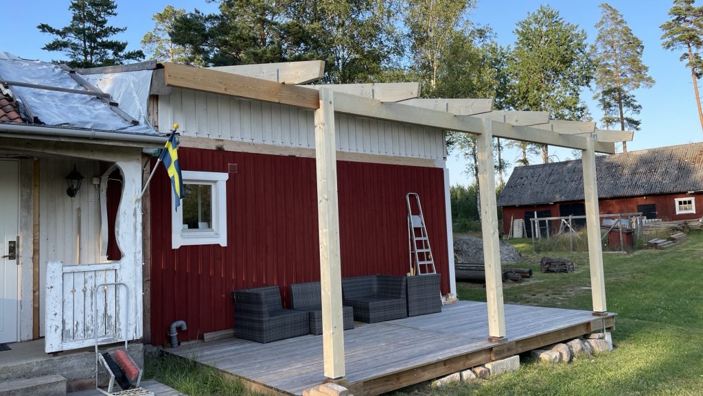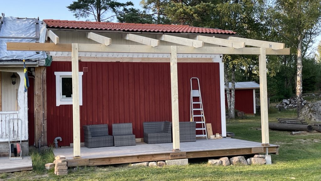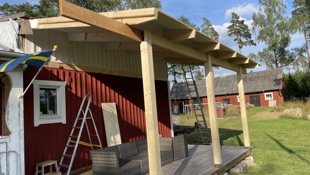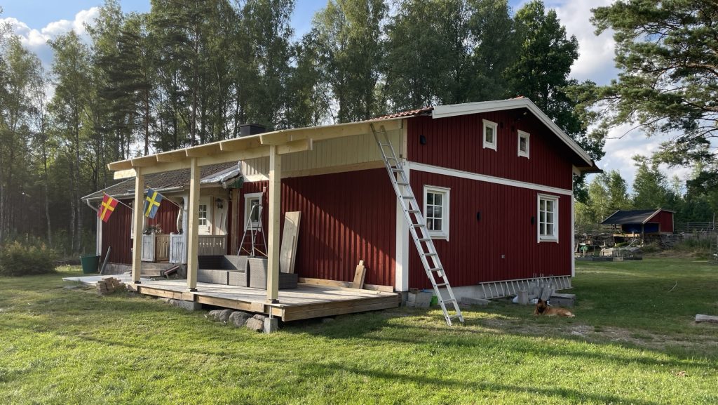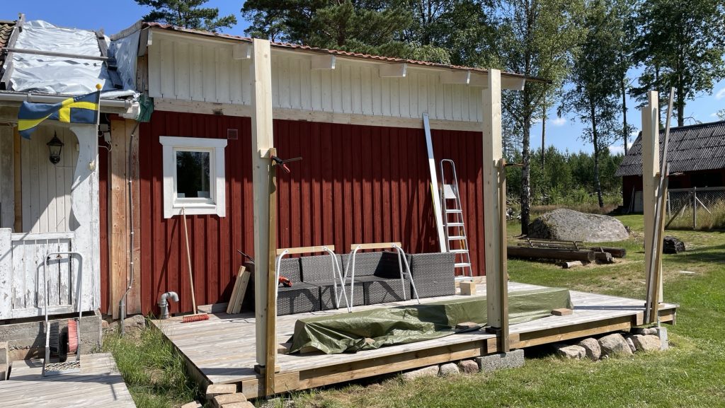 Det är i skrivande stund inte bestämt än. Men stoooor porch blev det. Första halva byggd, den andra kommer när gamla taket byts 🙂